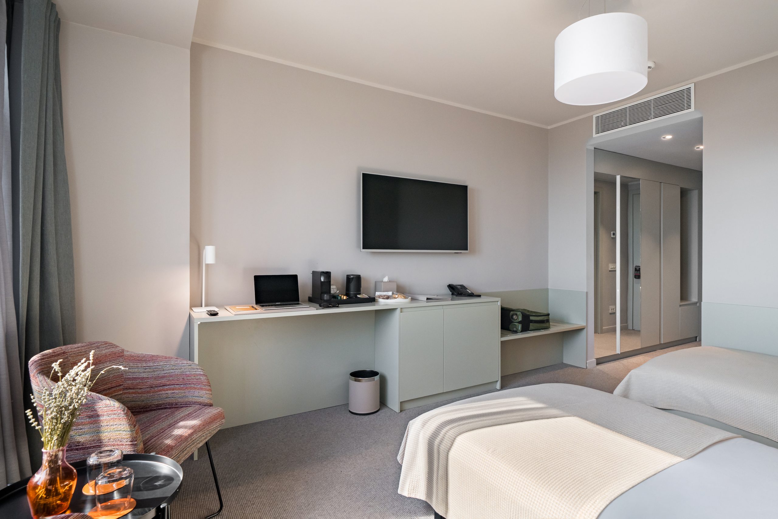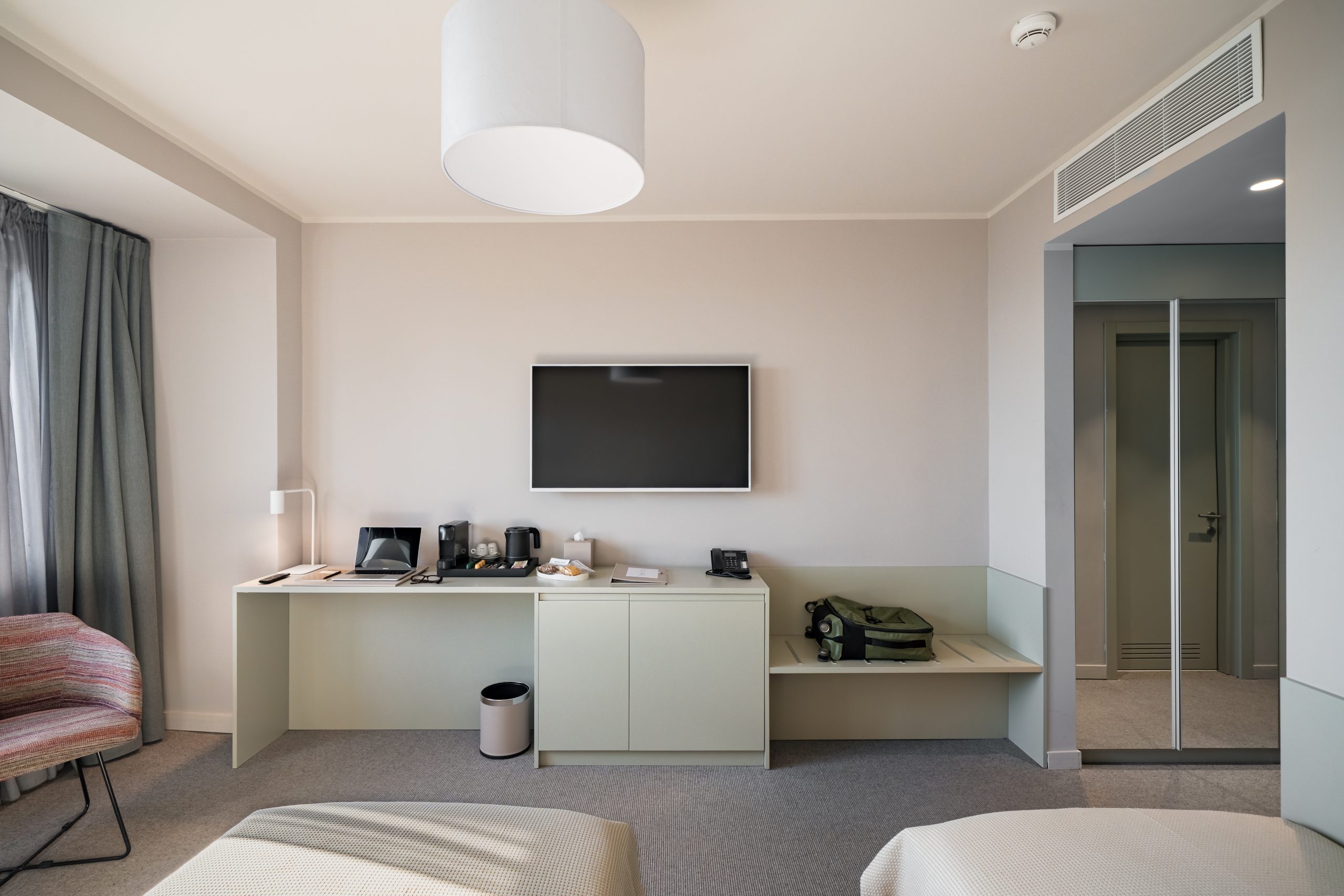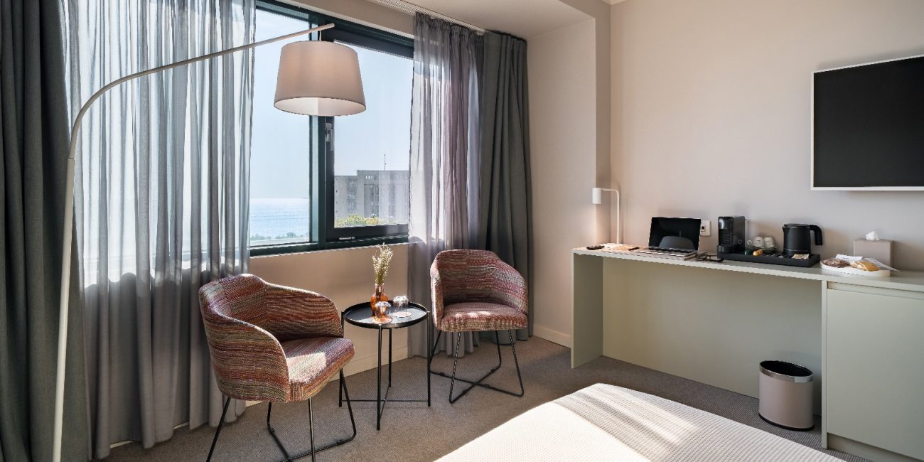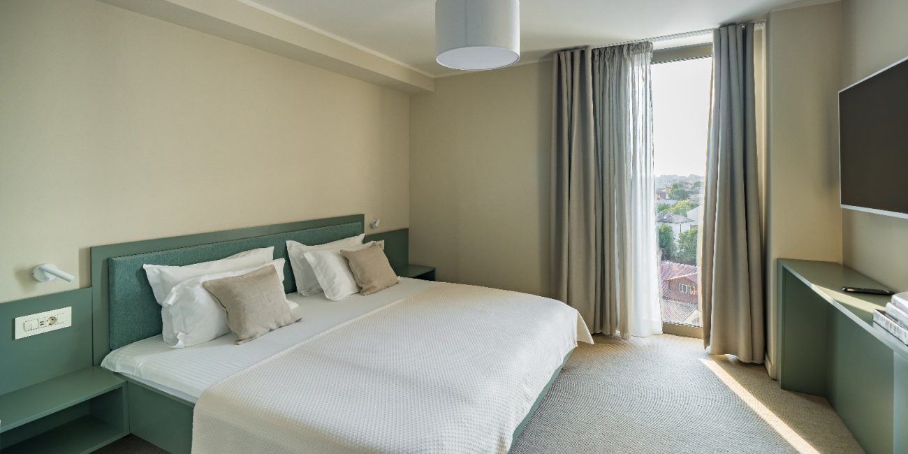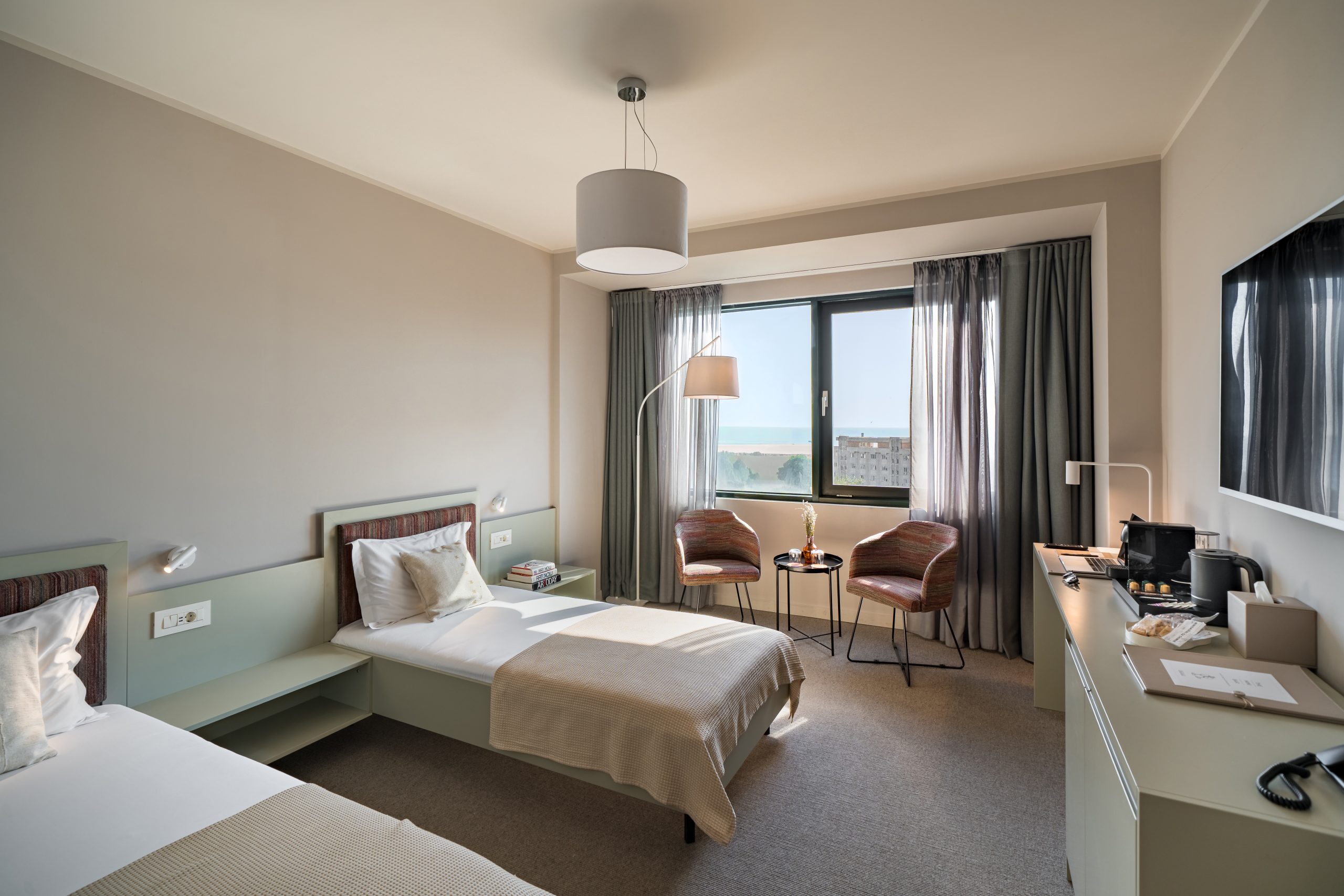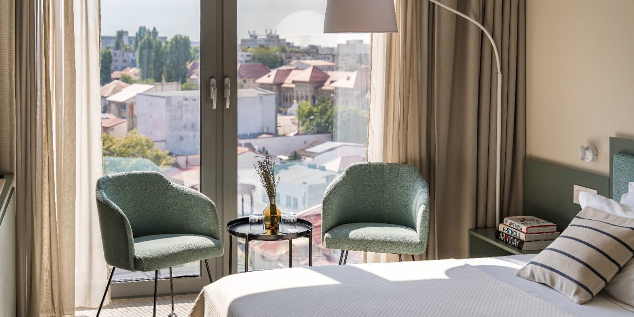 Aici veți găsi două paturi de dimensiuni generoase pentru un somn odihnitor, iar designul modern aduce un plus de eleganță. Facilitățile includ un espressor de cafea pentru diminețile perfecte, un birou funcțional, precum și un colț de relaxare cu fotolii și masuță.